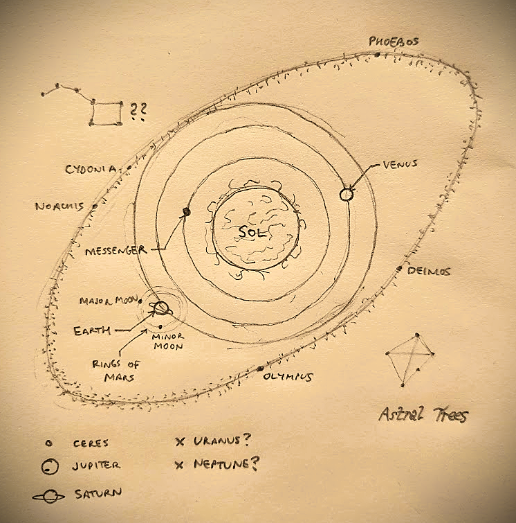 “For this month alone the Moon would gaze down on Earth with accompaniment, in this time when the Minor Moon would rise into view from the vermillion dusk to spin a web for itself next to its full-bellied parent. Hereon Major and Minor would embrace in silence with the affection of friends reunited after a long journey, and light up the evenings with a brilliant luminance made possible by the rays refracted off the Rings of Mars. For the people of Verdigris, it was an annual celebration of the cosmos, as well as an admonition to understand a knowledge that had been lost to them; for there were none left alive who knew of that age of darkness – when the night was lit by one lantern – or of the calamitous event that led to its downfall. There were things known and things extirpated, eaten away like a page in a dusty book, and even the most learned of Verdigris’ citizens saw their world in the light of an incomplete jigsaw puzzle rather than breaking any new trodden ground….”